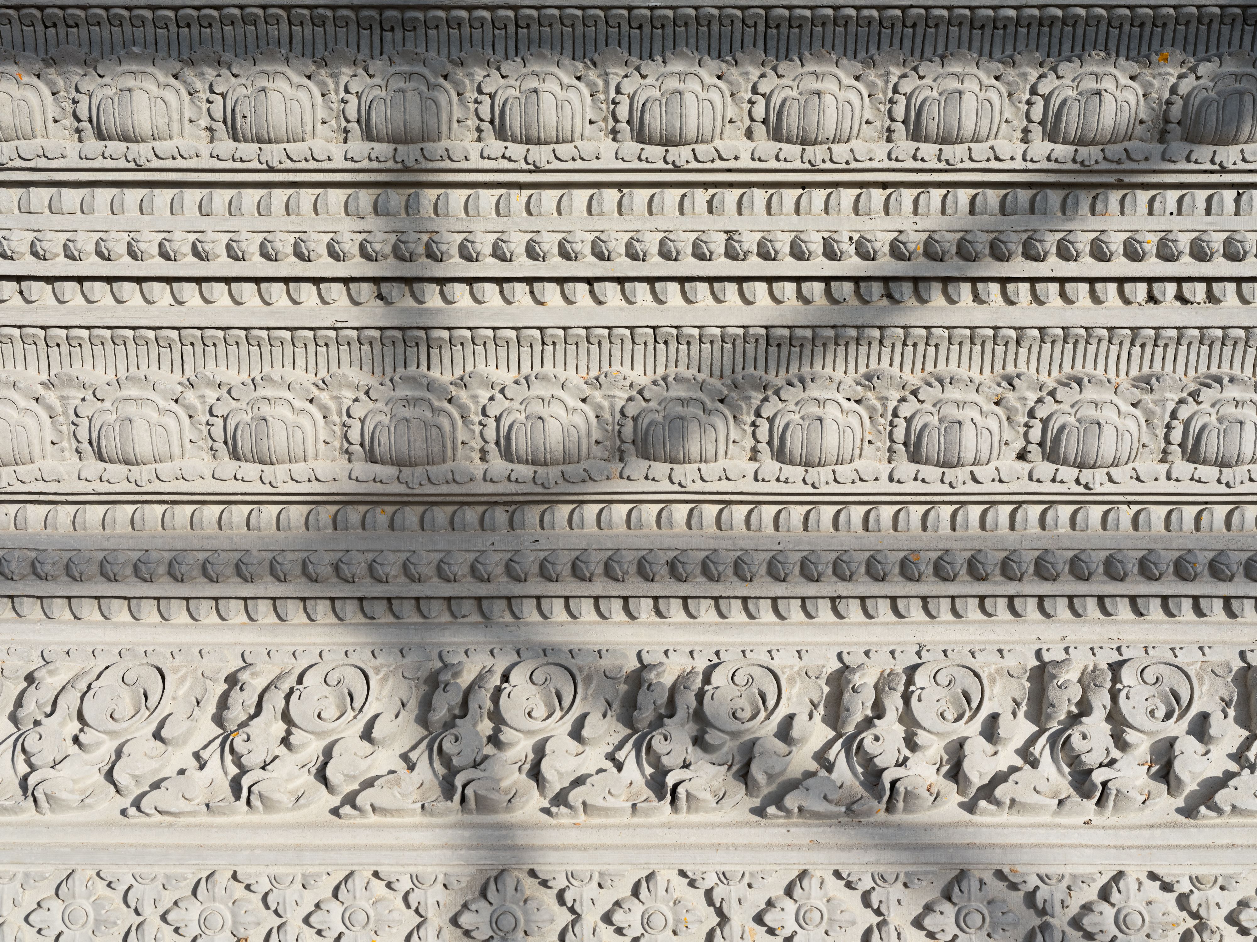 The wall base is adorned with kbach rachana, the classical ornamental language of Khmer architecture. These particular motifs draw inspiration from Banteay Srei, the tenth-century temple celebrated for the precision and refinement of its carvings. Often described as the jewel of Khmer art, Banteay Srei is known for its intimate scale, intricate ornament, and is one of the most admired expressions of Khmer artistry.