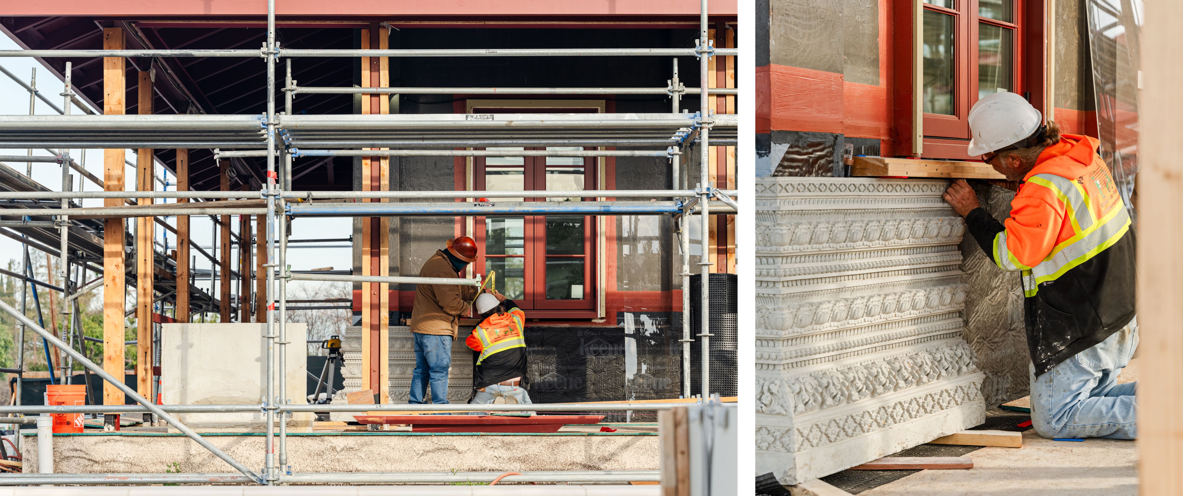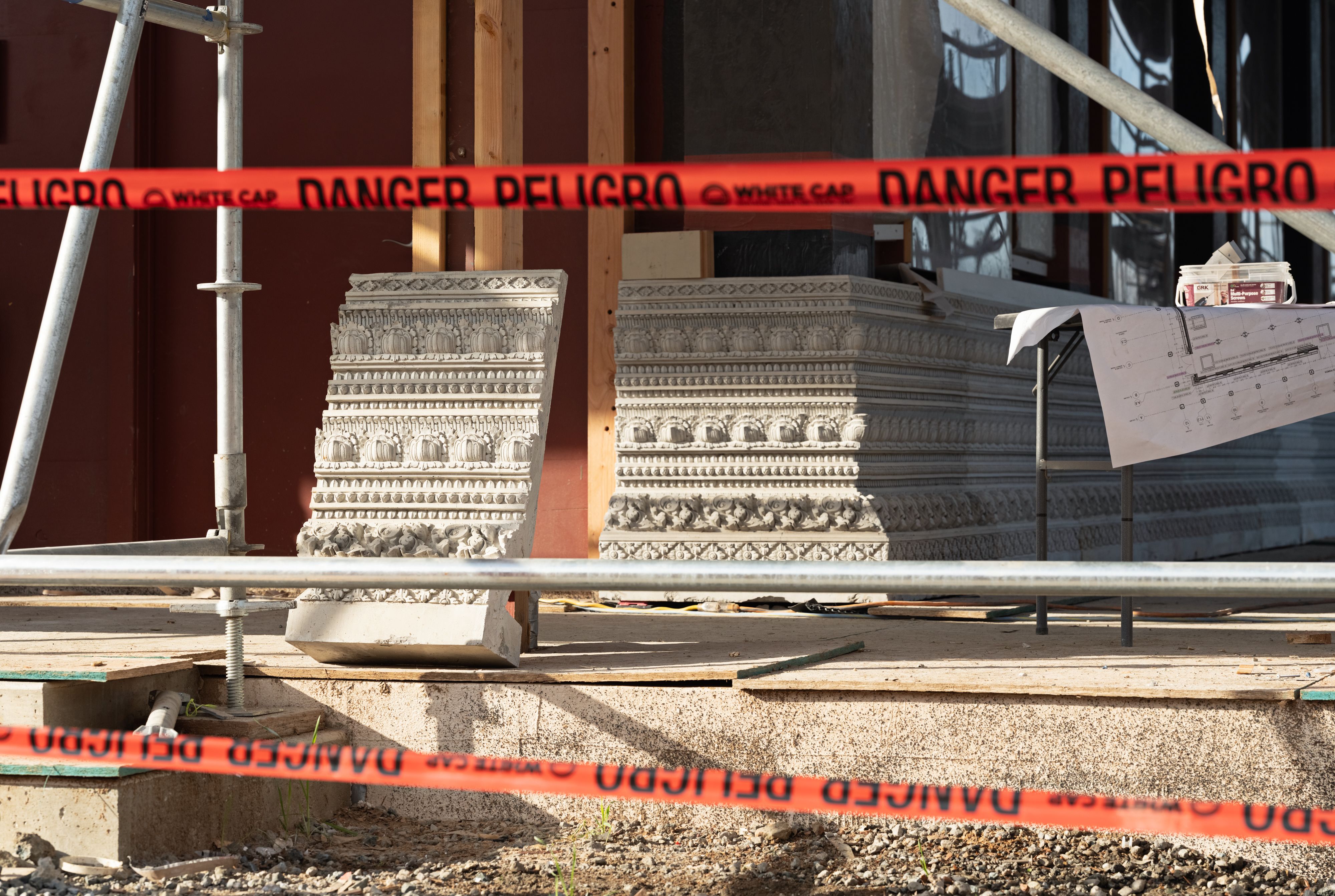 Along the exterior walls of the main sanctuary, decorative wall base elements are now being installed. These pieces sit at the base of the wall and begin to define the perimeter of the building.