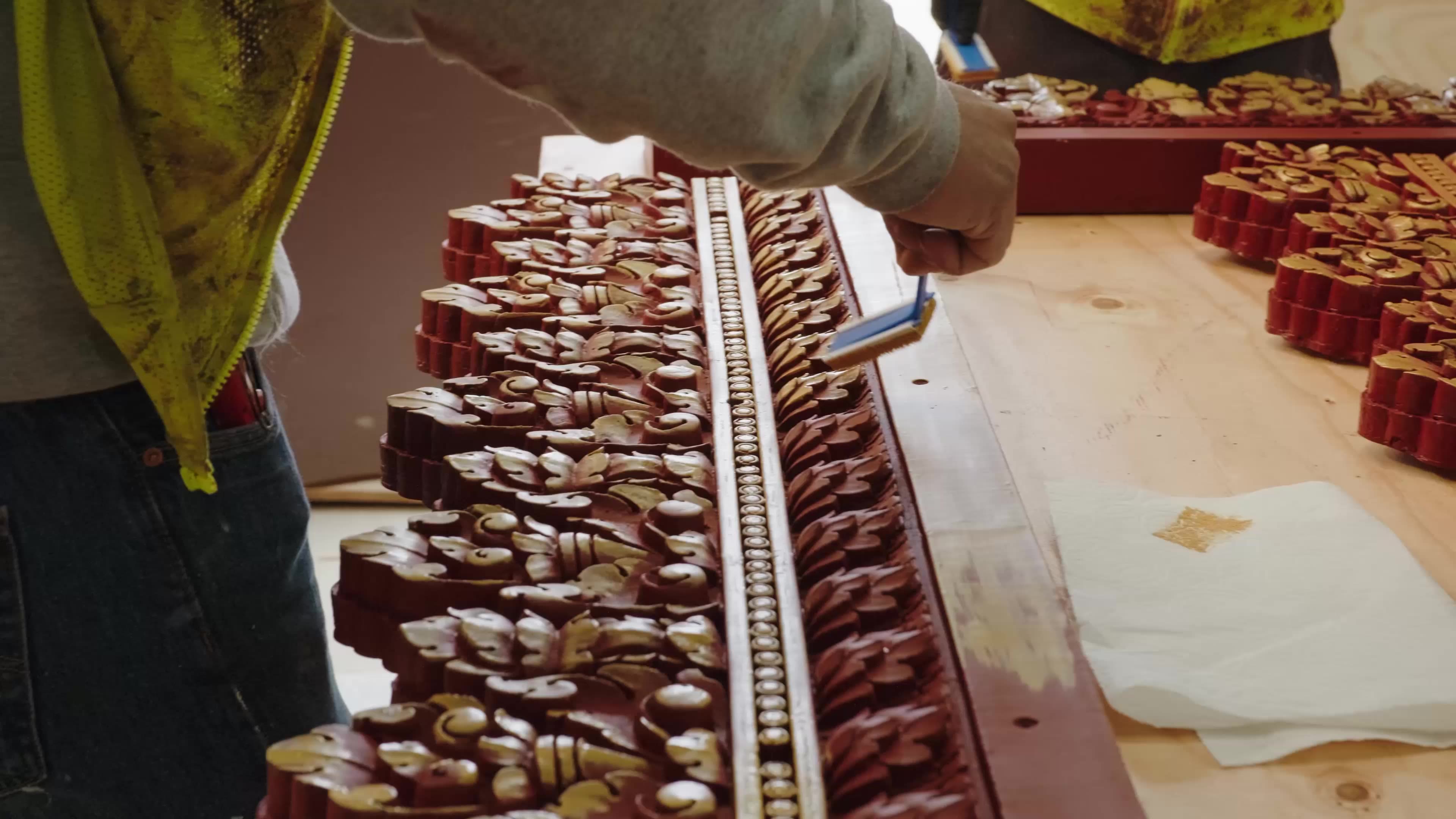 The process begins with a red base coat that establishes the field color. Gold accents are then built up in layers, moving from an initial pass to a brighter metallic finish. Rather than covering the entire piece in gold, the painters leave areas of red exposed. That contrast helps the carved forms read clearly from the ground.