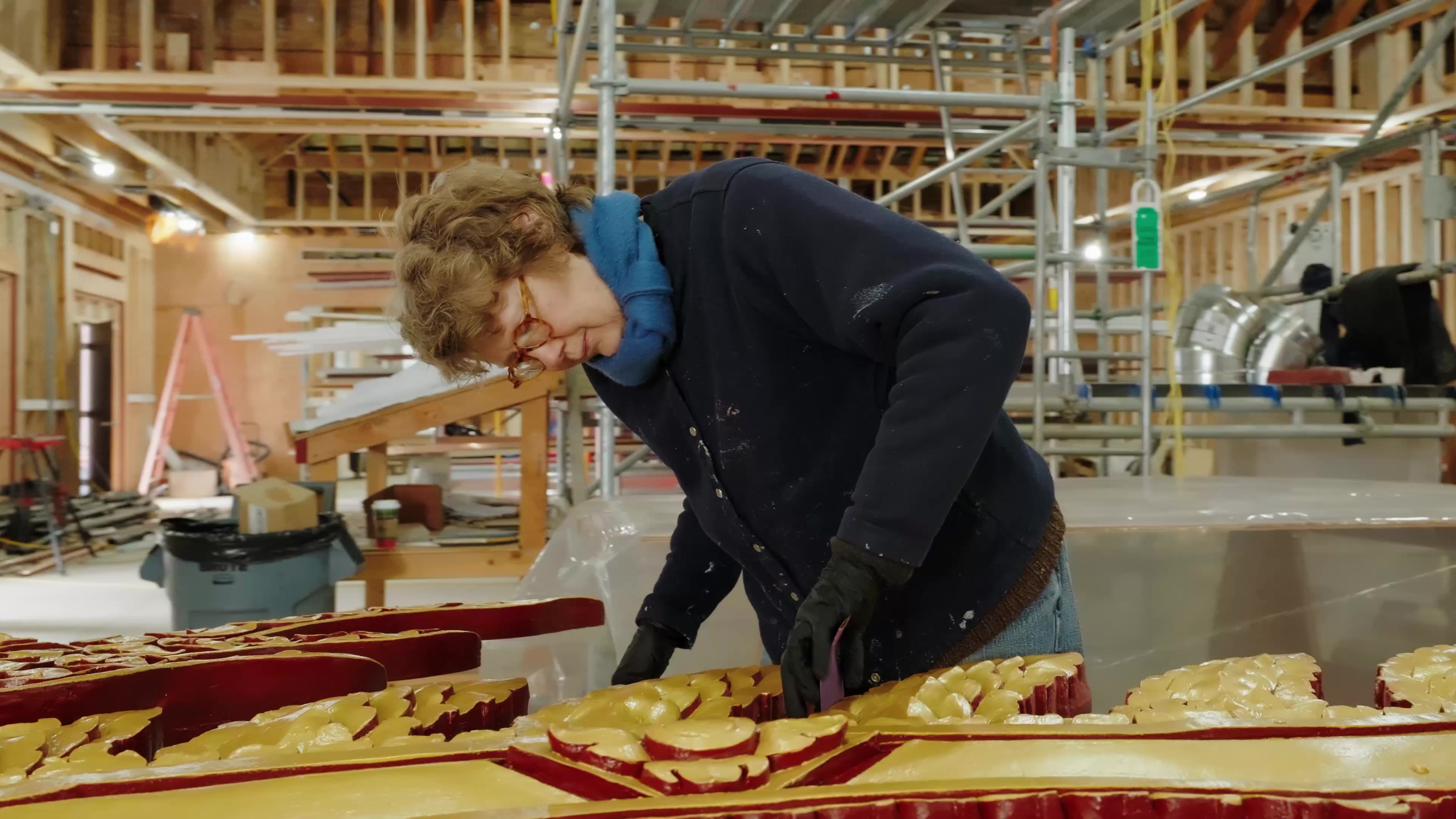 The team has set aside space to finish ornamental roof-edge components before installation. Fascia elements are laid out so painters can work efficiently and maintain consistency across the set.