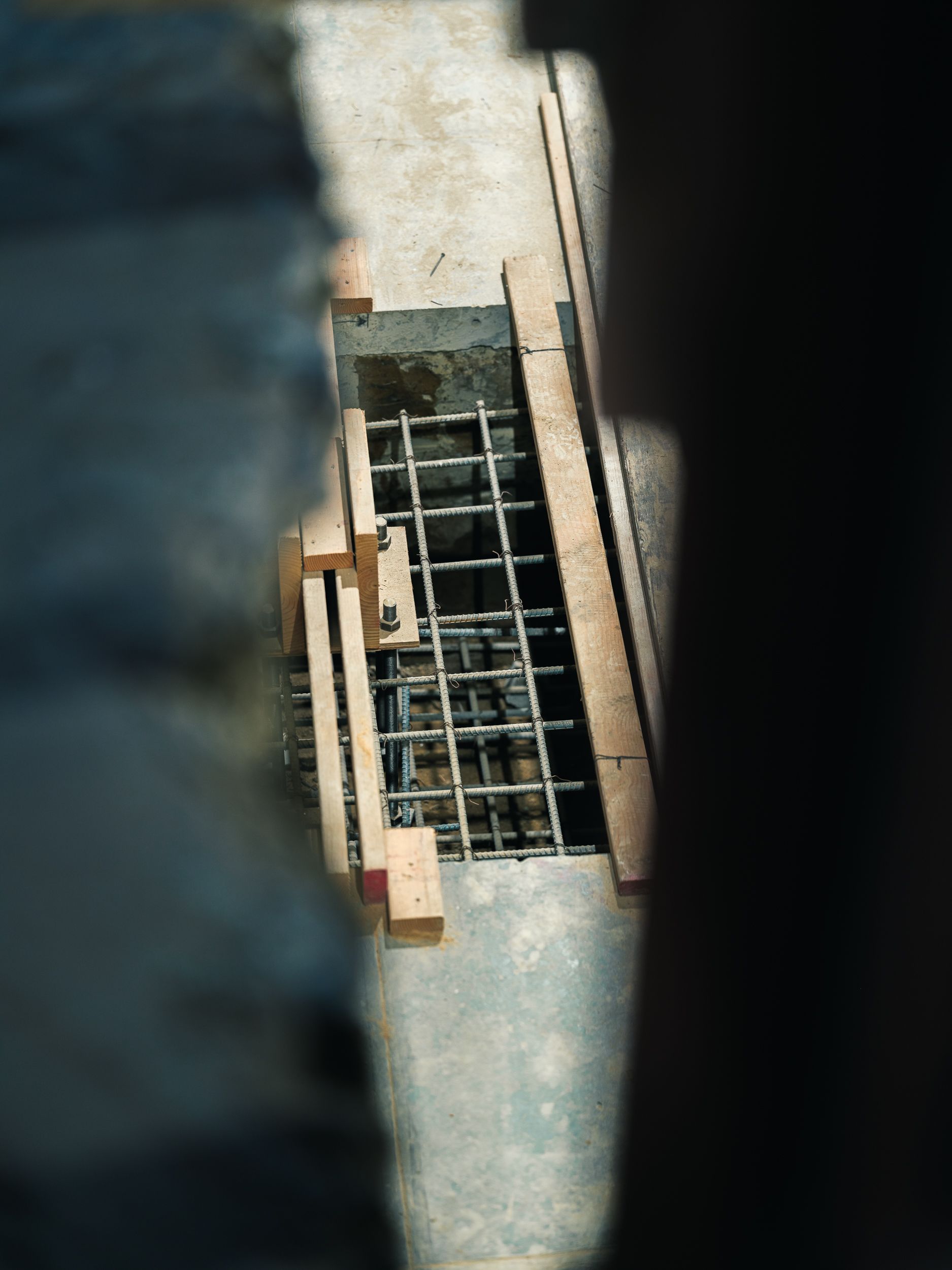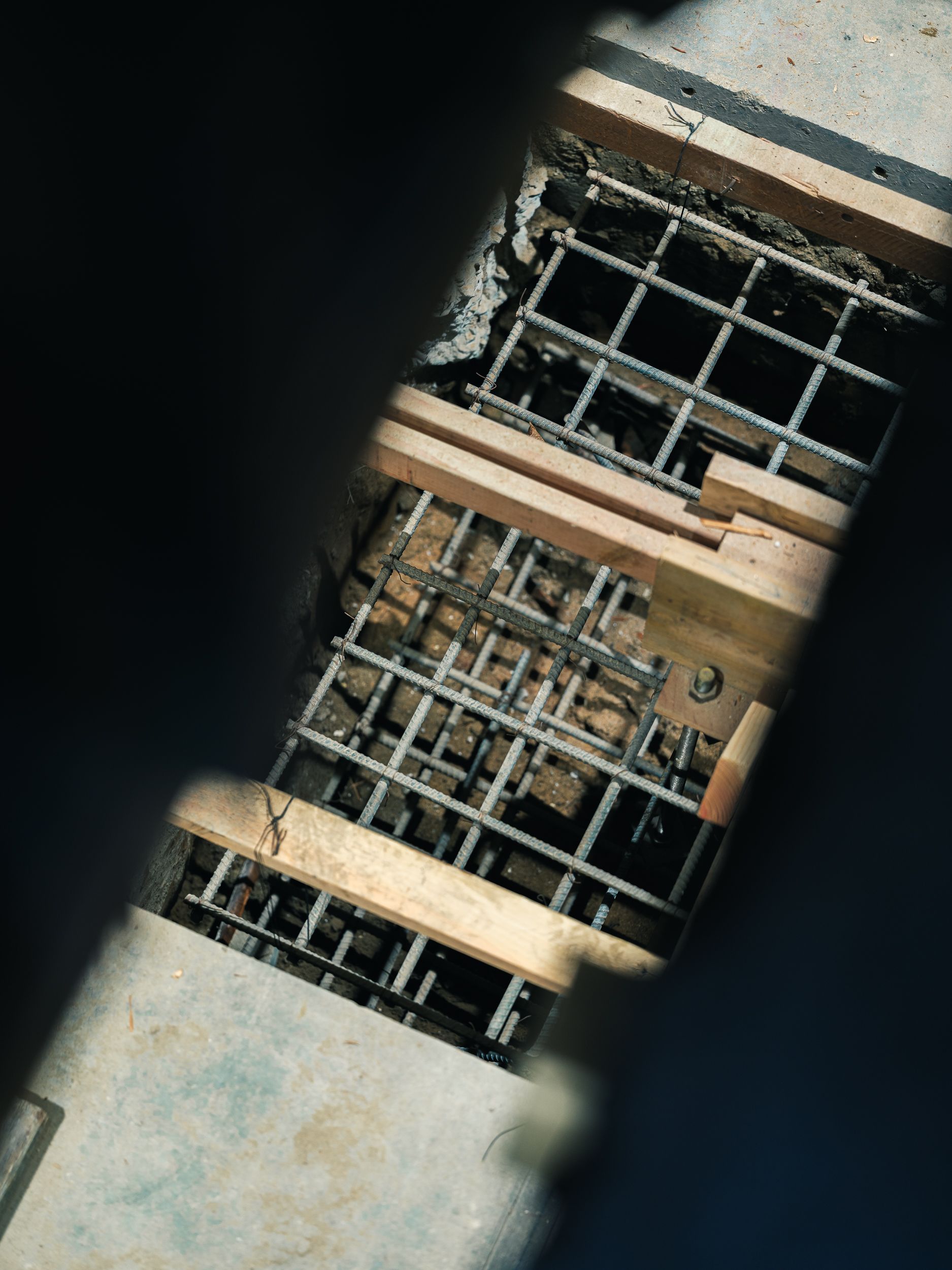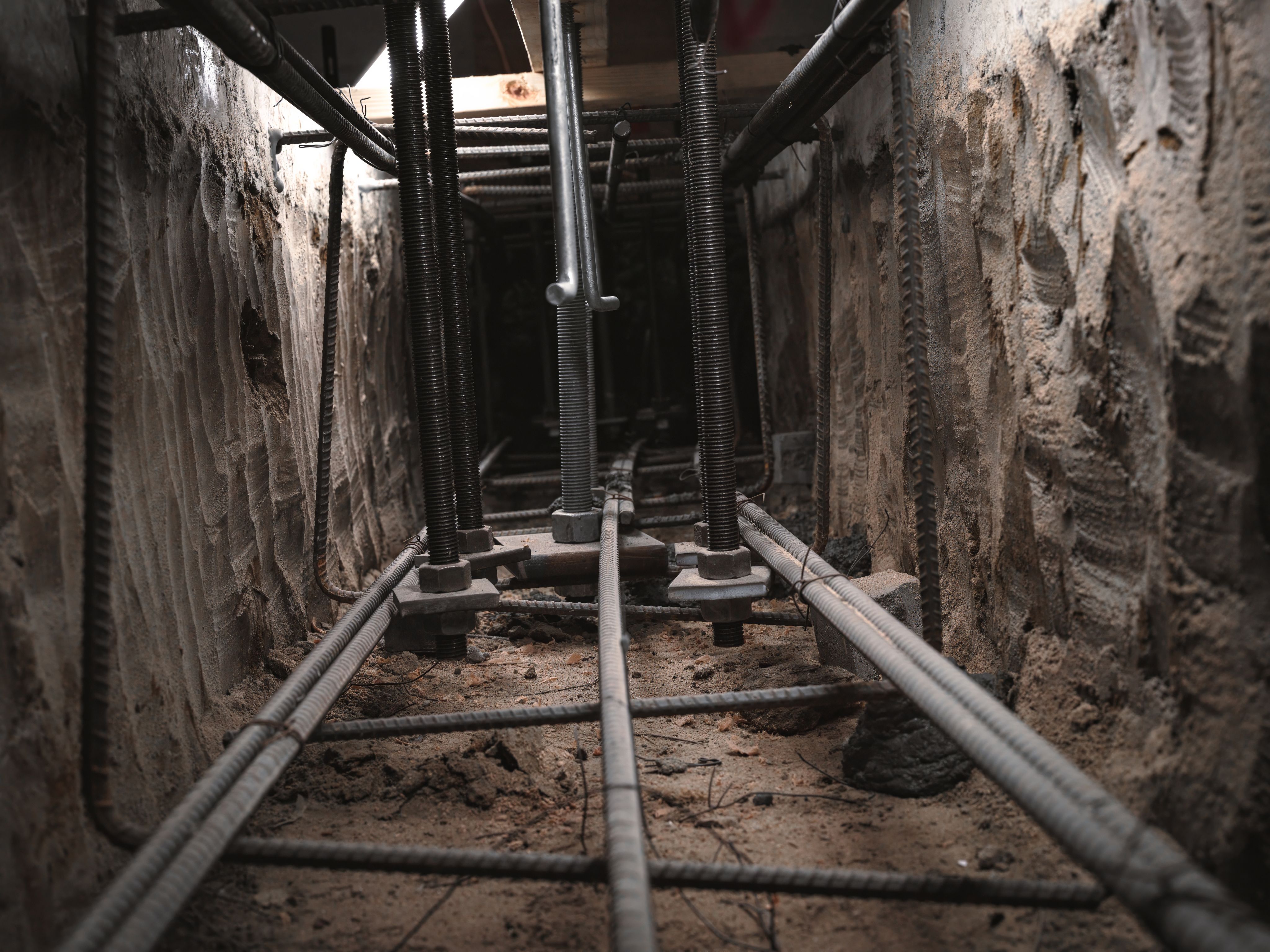Stand on the first floor and look down through newly opened sections of the floor deck. Below, layers of transformation are underway. Open bays reveal hand-dug footings, each one carefully reinforced with rebar. In spaces too tight for machines, every inch has been excavated, formed, and set by hand. These footings will support new steel columns—tying the reimagined structure together from the ground up.
