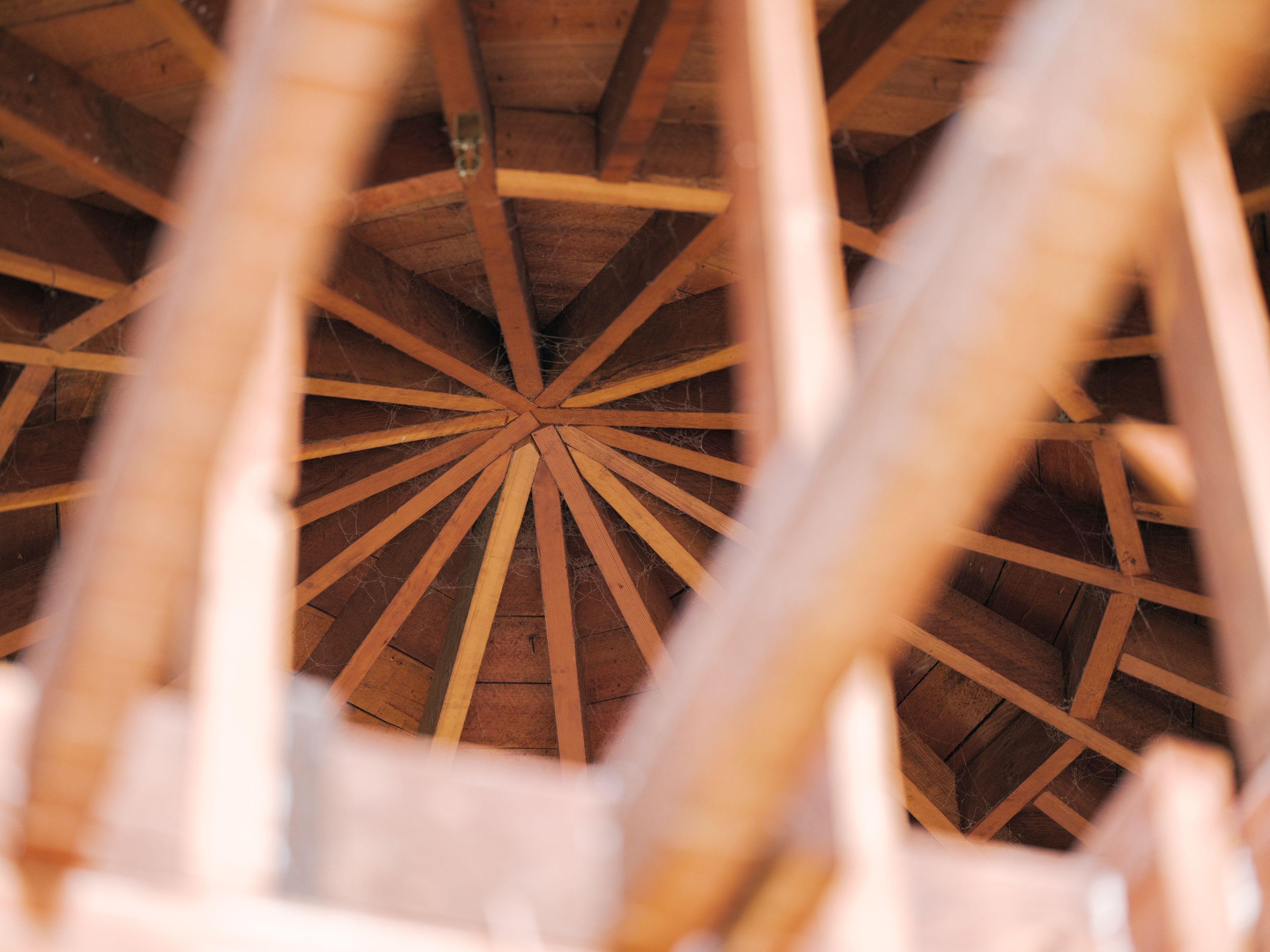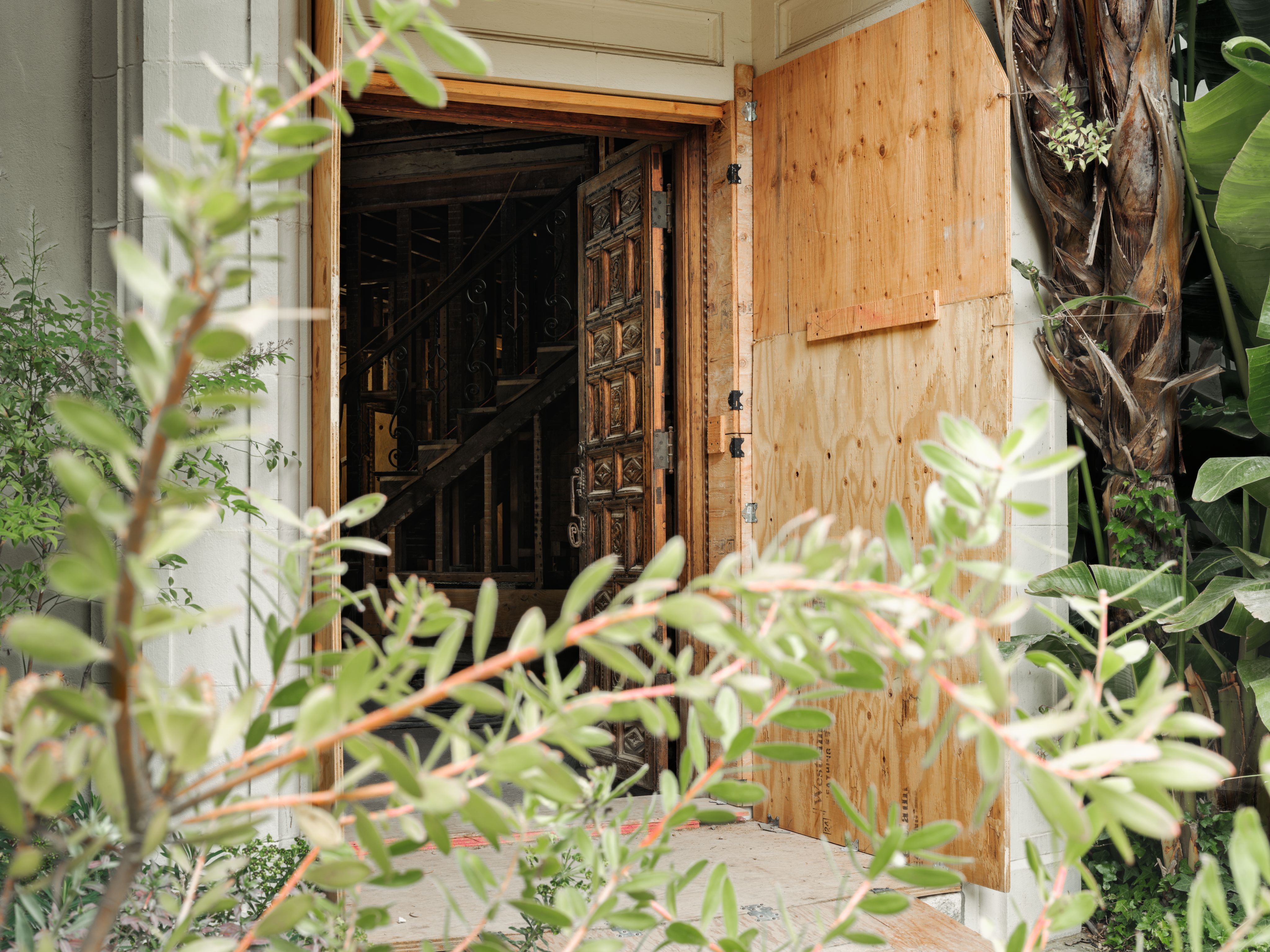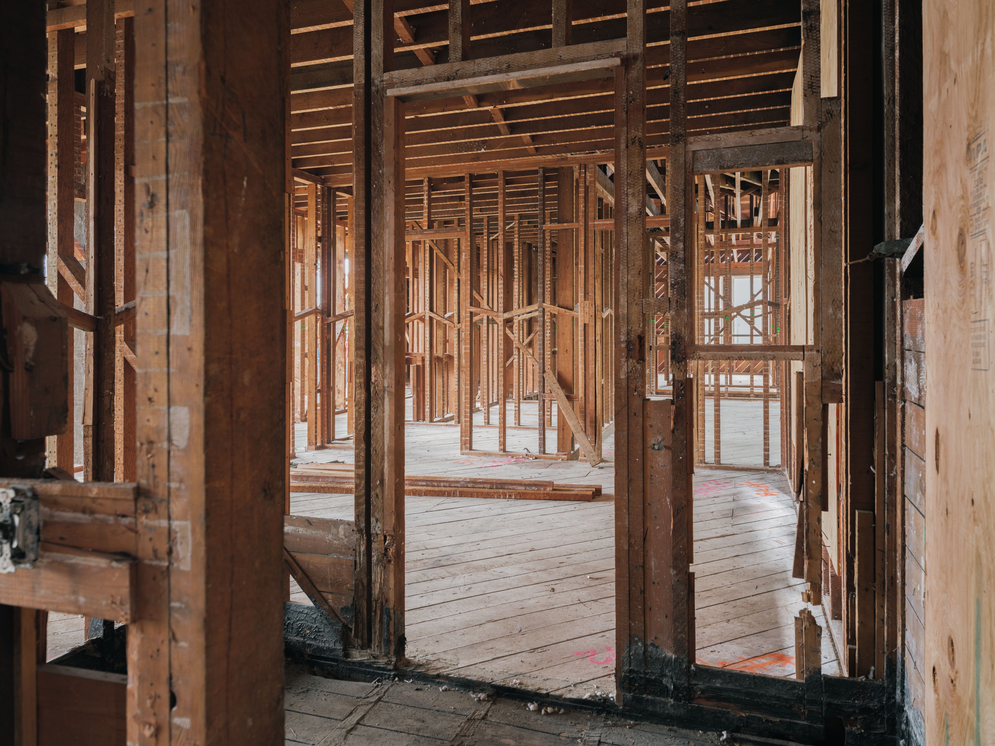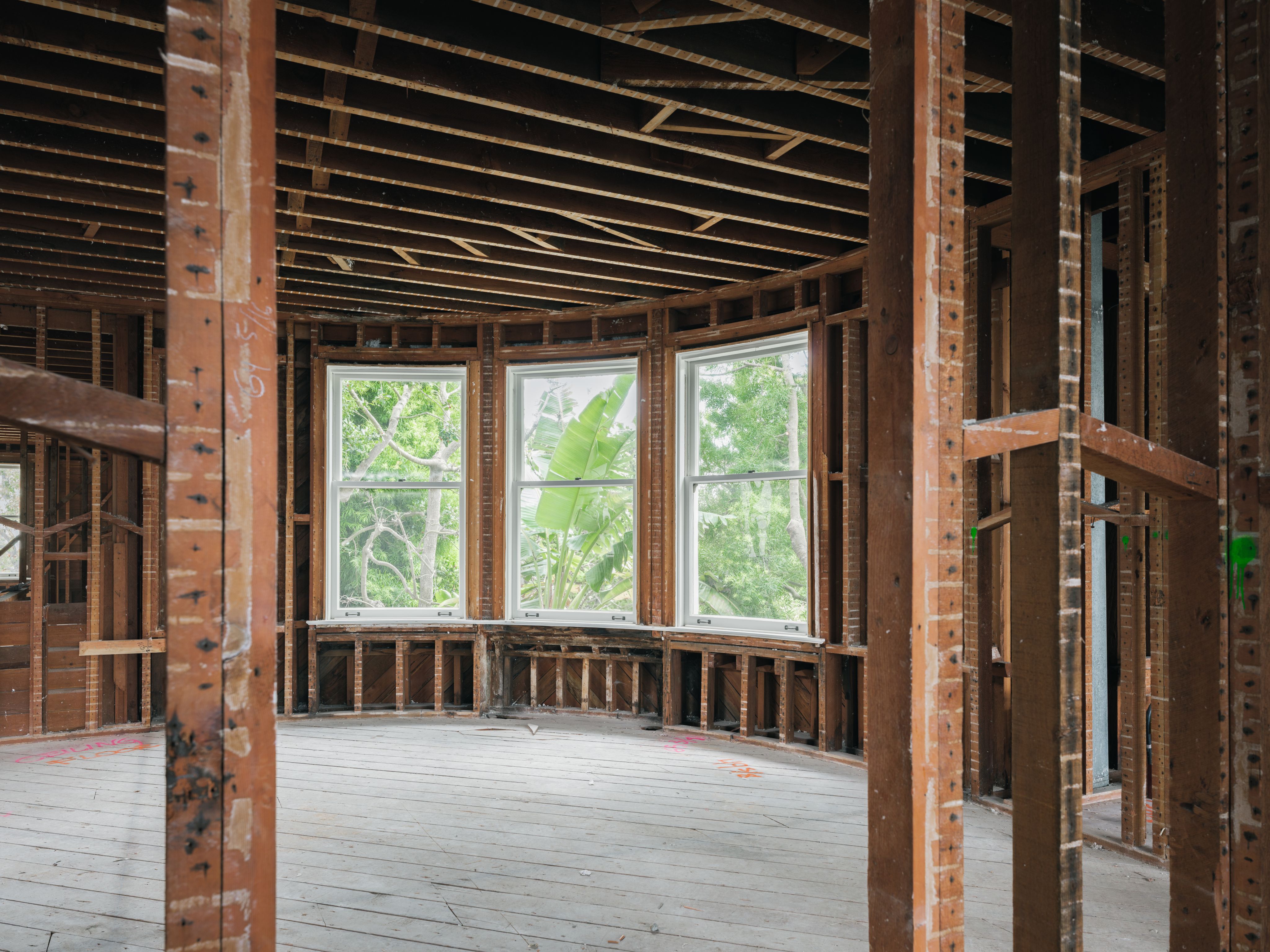Inside, the house has been stripped to the bones. Most of the framing is old-growth redwood—exposed and intact after decades in place.