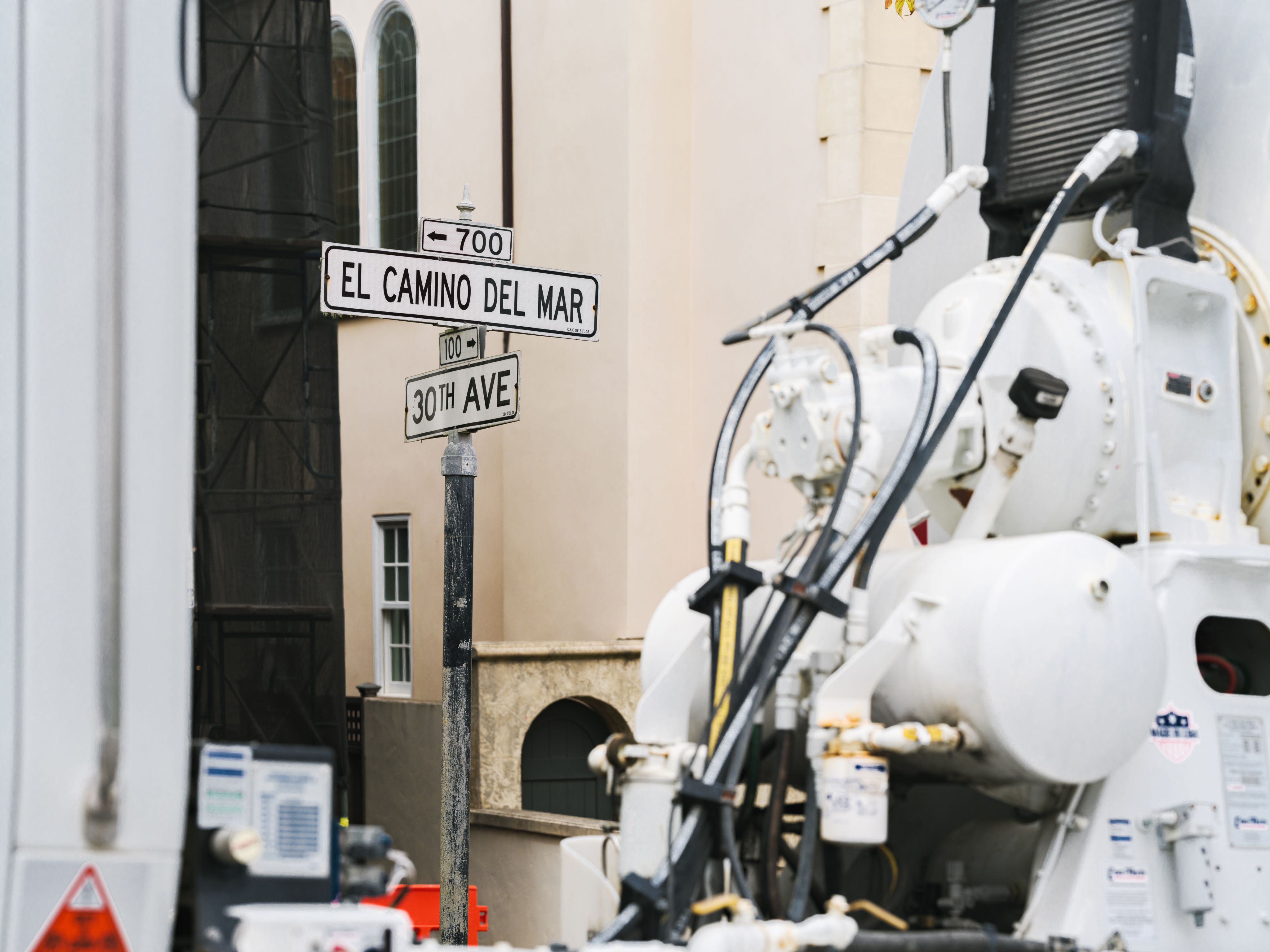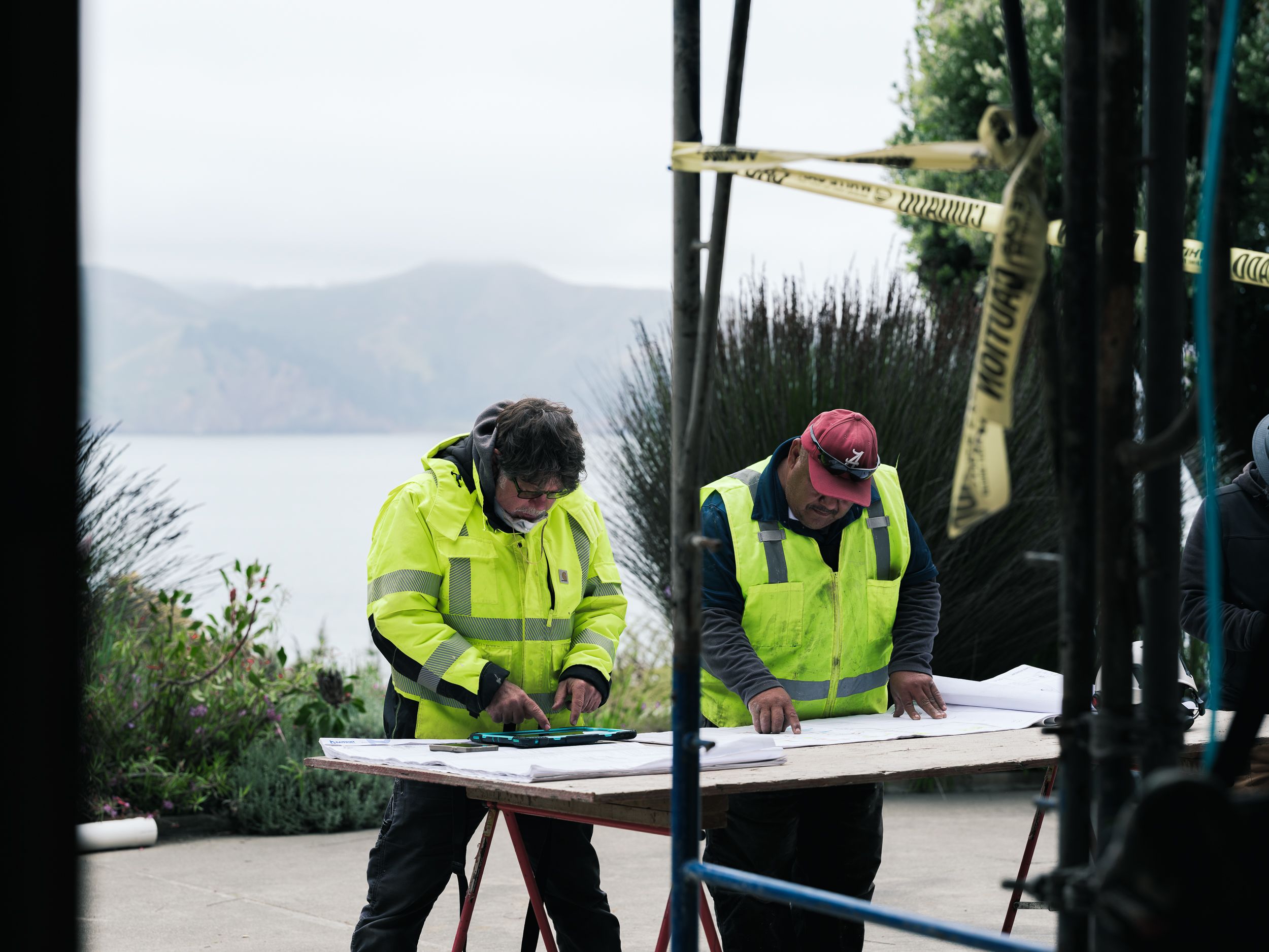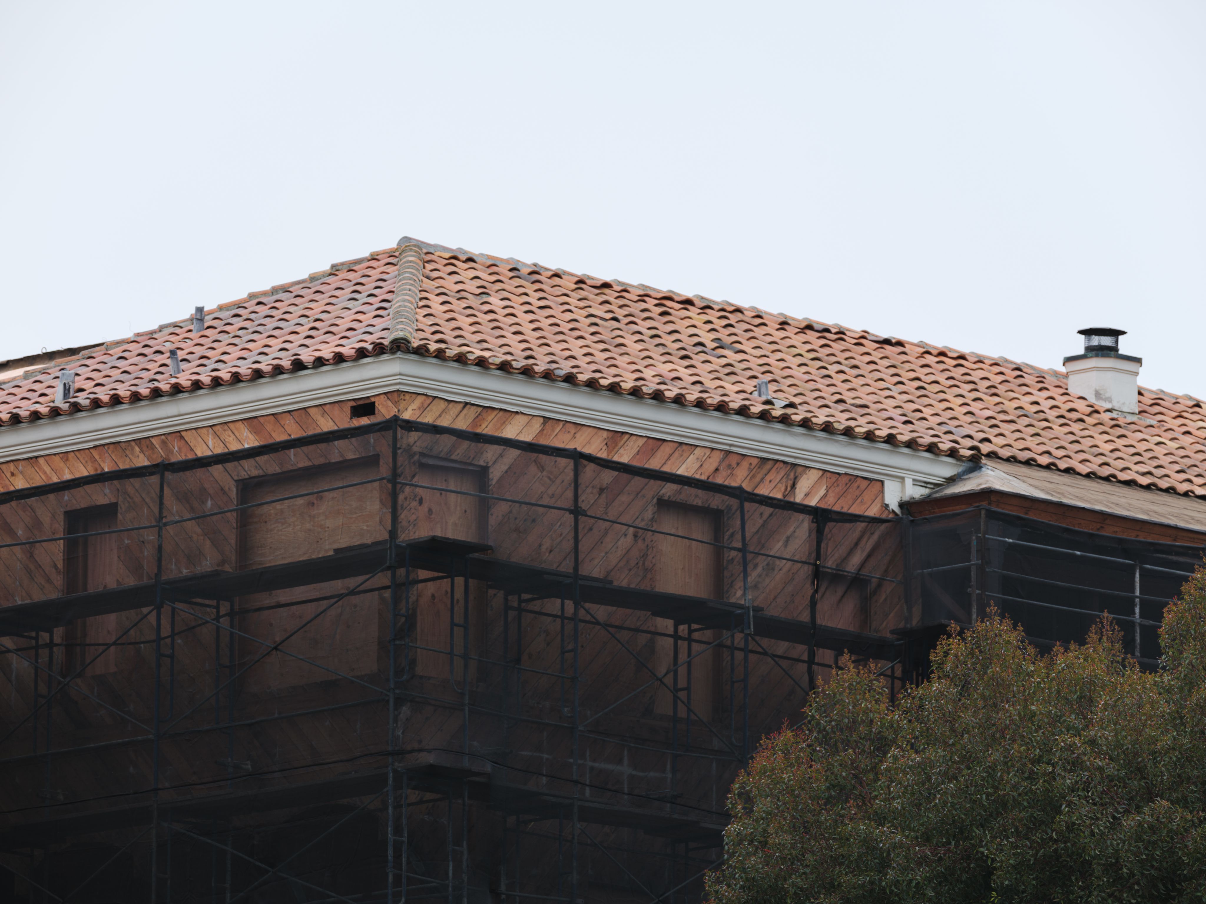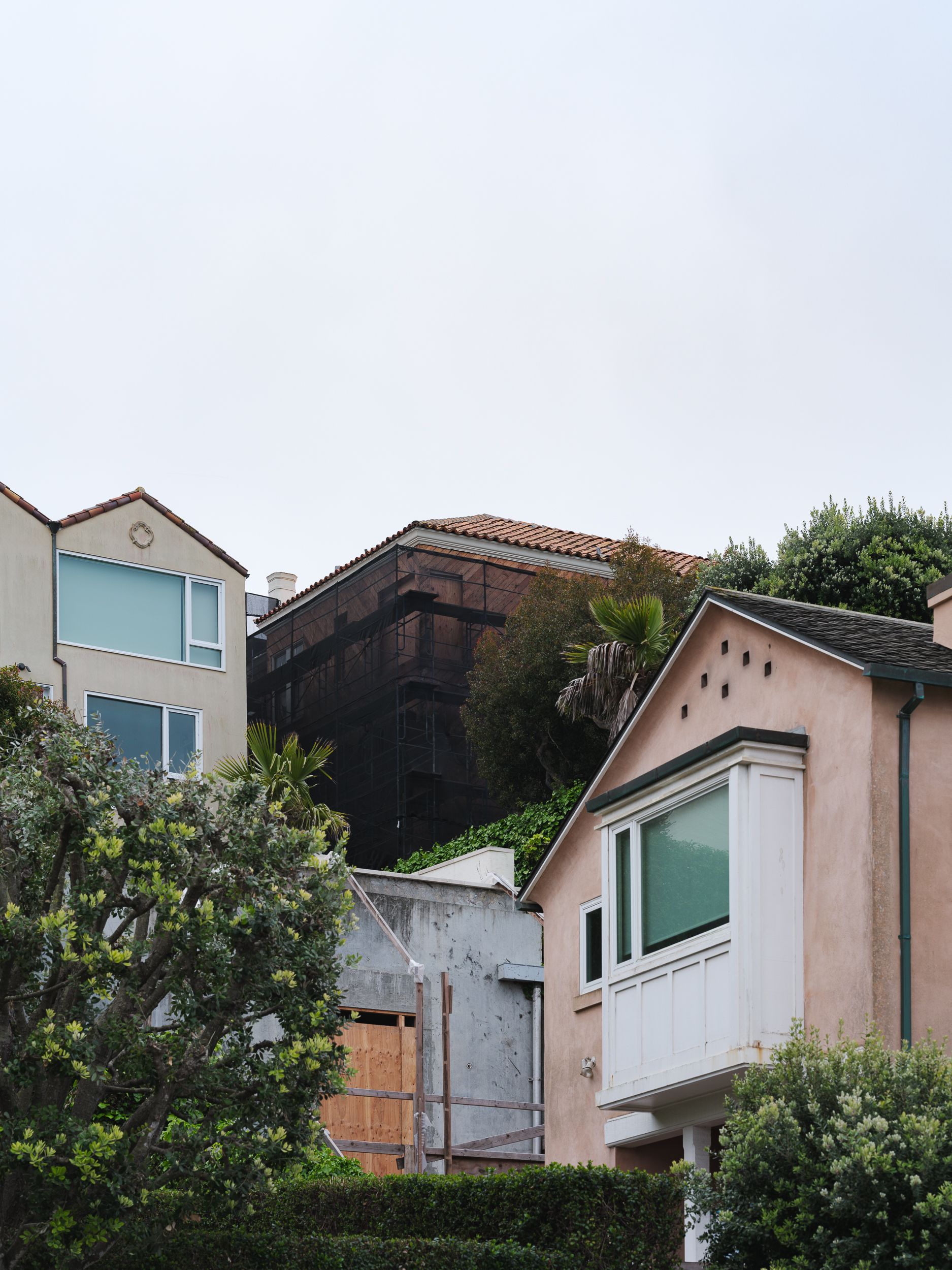 From the bluff above China Beach, the house sits quietly in the fog—wrapped in scaffolding, perched just above the edge.